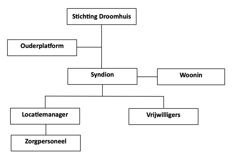 Om het Droomhuis als zorginstelling te kunnen laten functioneren is er een organisatie gevormd die er uitziet als in het plaatje hiernaast.